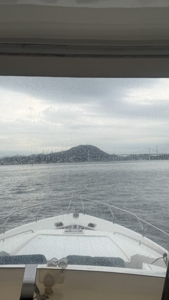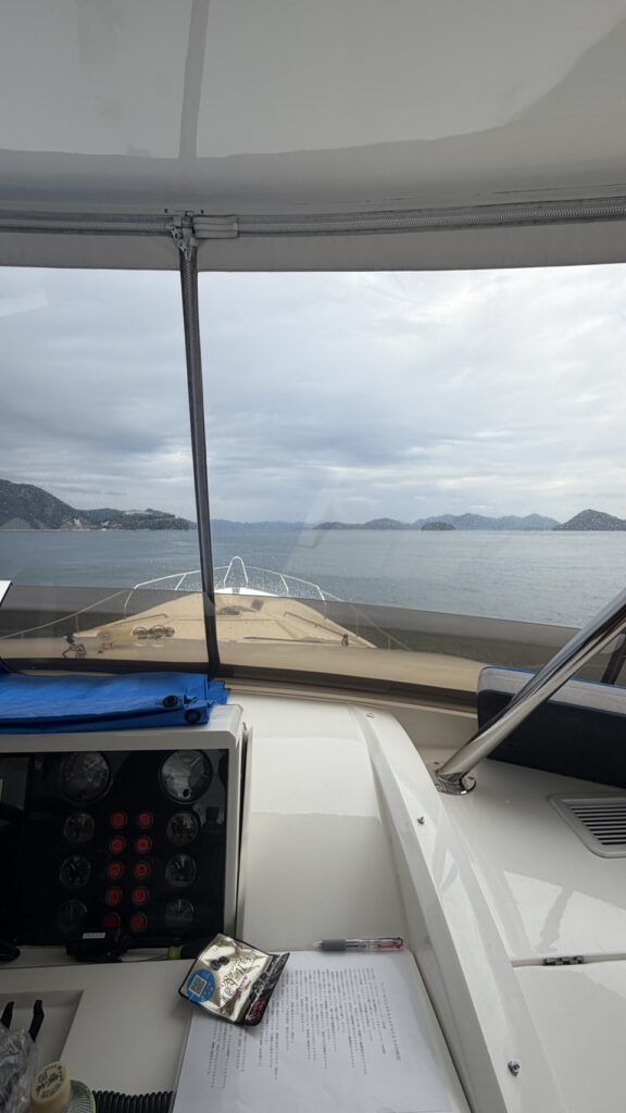 今日は東の風が強く、85フィートの大型艇でも波しぶきを受けながらの航海。