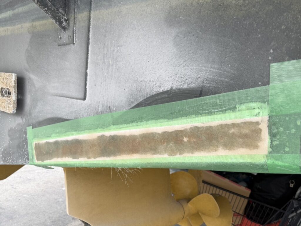 まずは既存トリムタブを取り除き、旧トリムタブ取付け穴をファイバーグラスで補修。