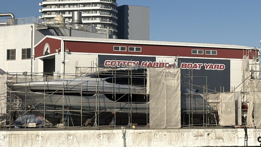 コットンハーバーボートヤードでは、現在上架整備中のリーバ76様を沖から撮影。