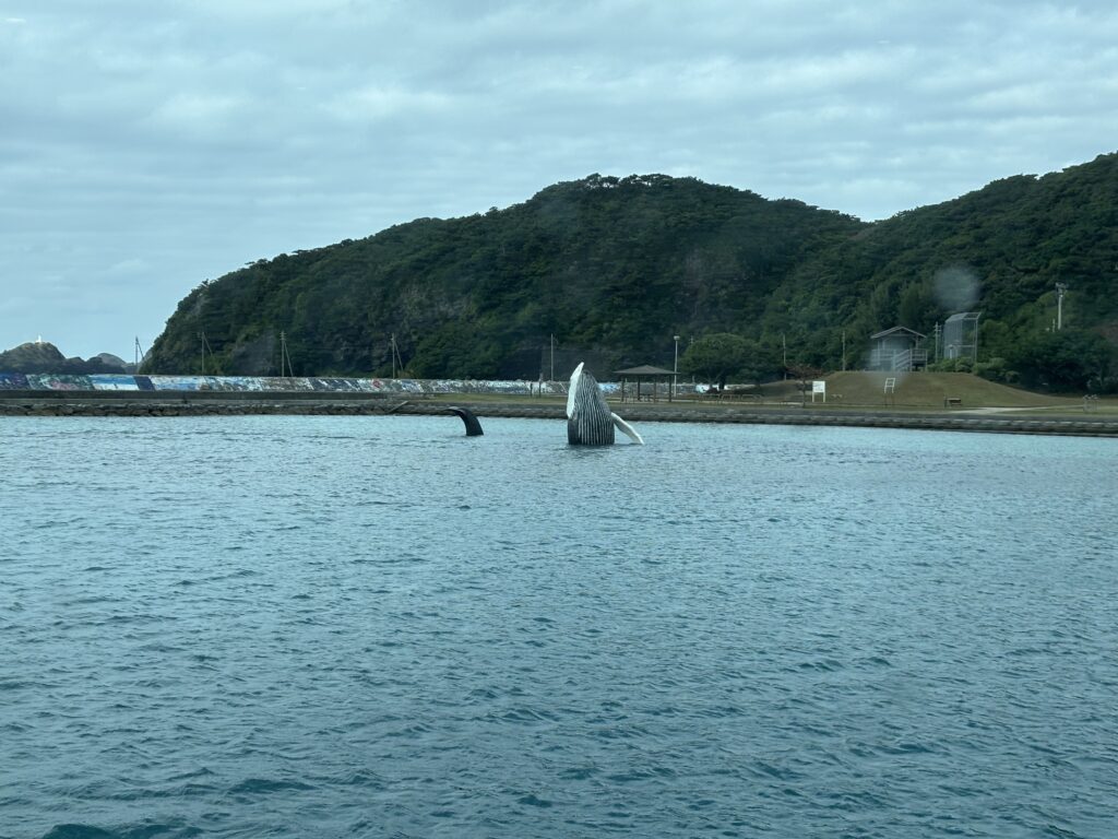 クジラのモニュメントがお出迎え。座間味島に到着です!