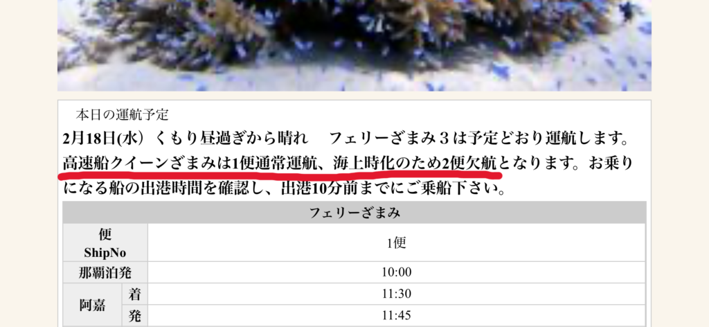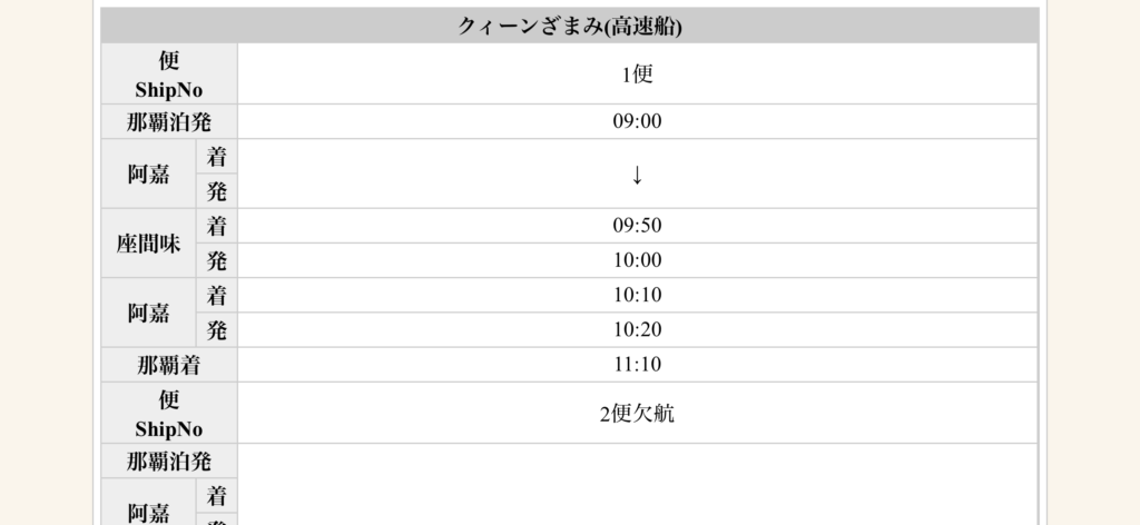 ちなみに座間味島へのアクセスはフェリー・高速船ともに1日2便(2往復)のみ。