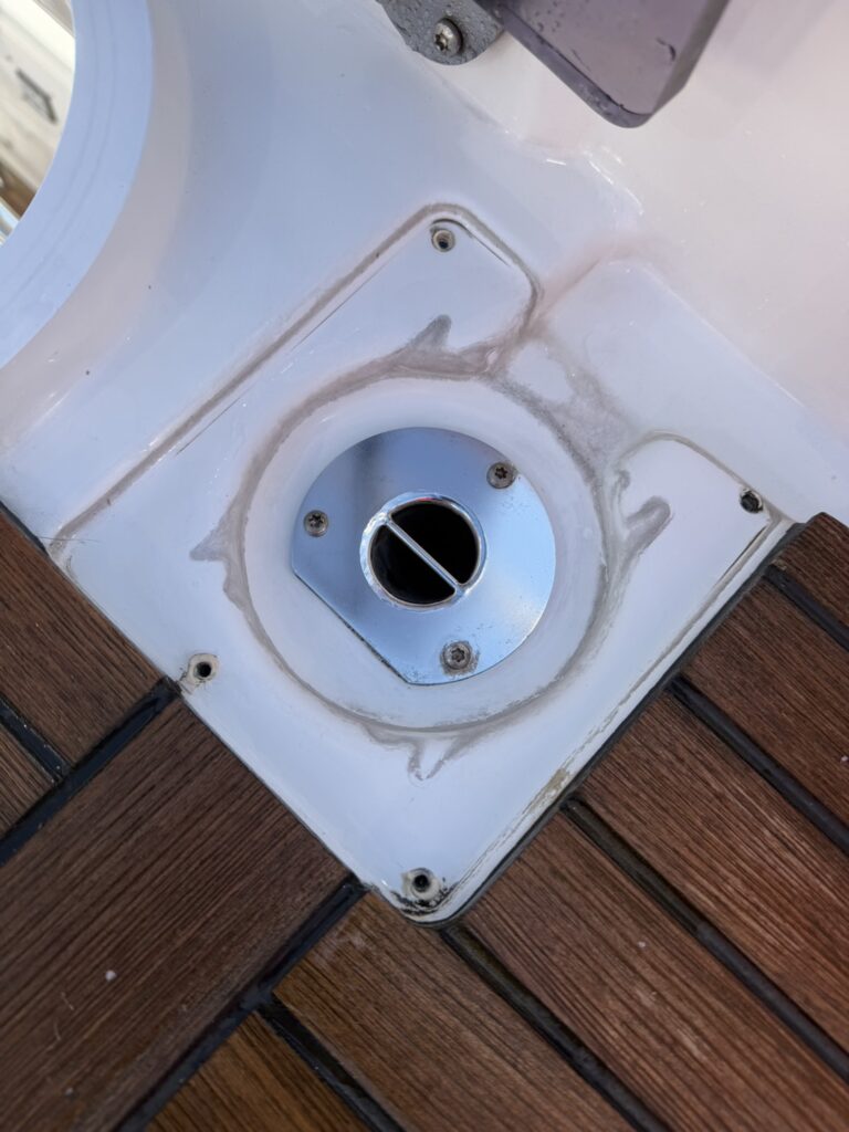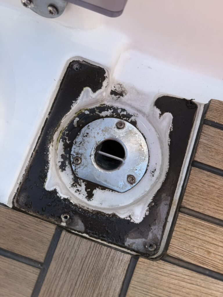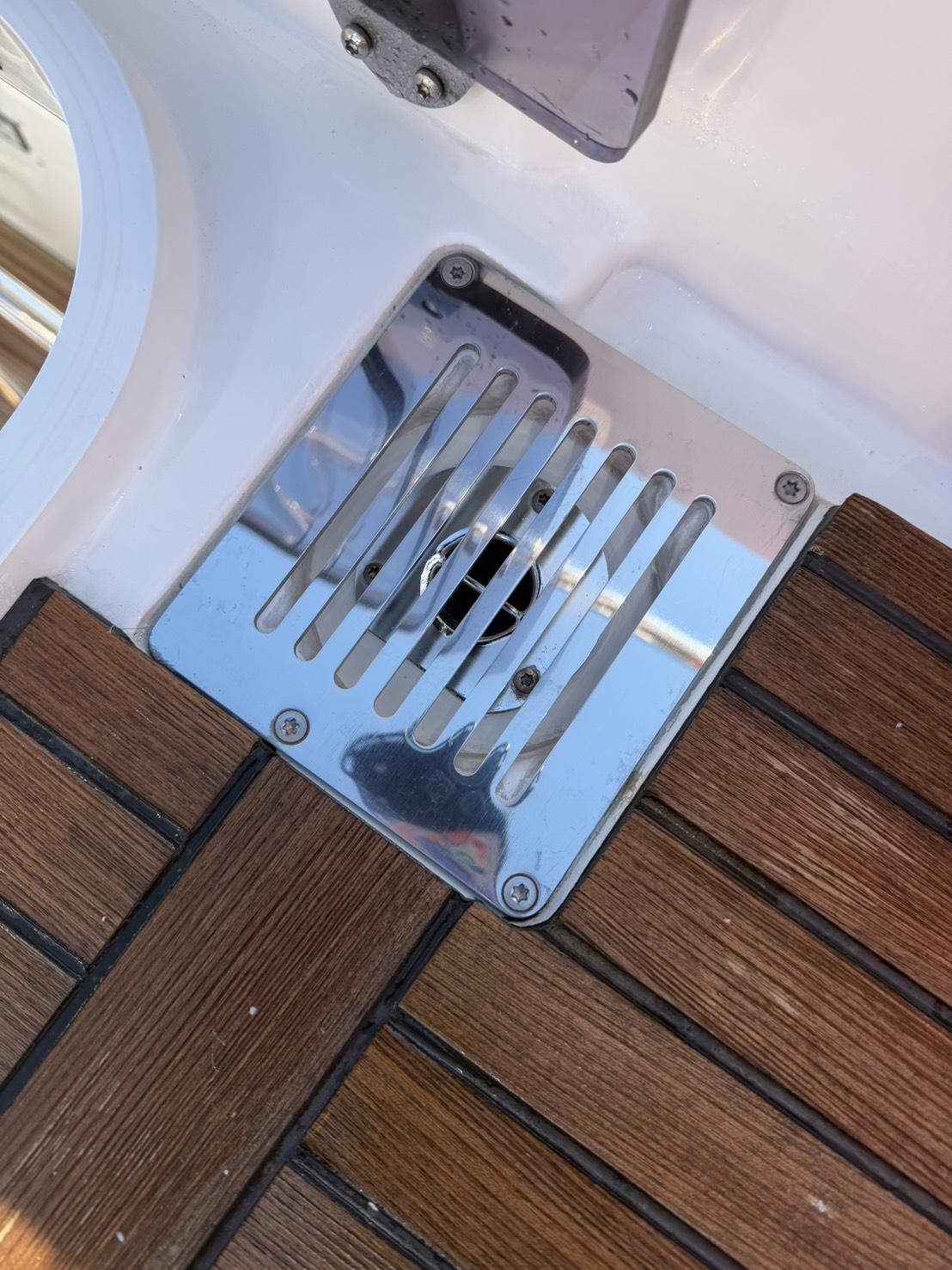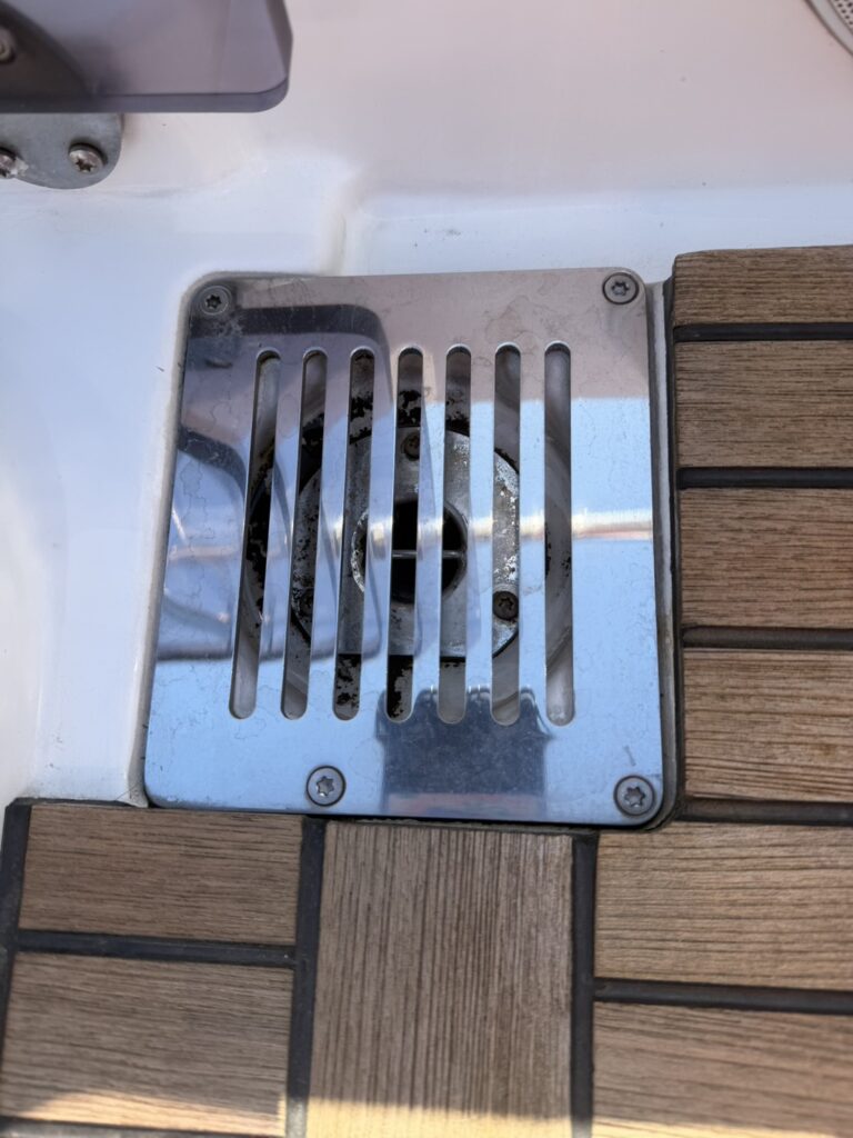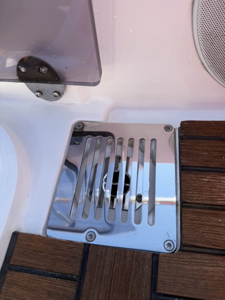 今回は、プレステージ460様のFB(フライングブリッジ)の排水溝周りに砂埃汚れが溜まってきていたため、カバーを取り外して洗浄を行いました。