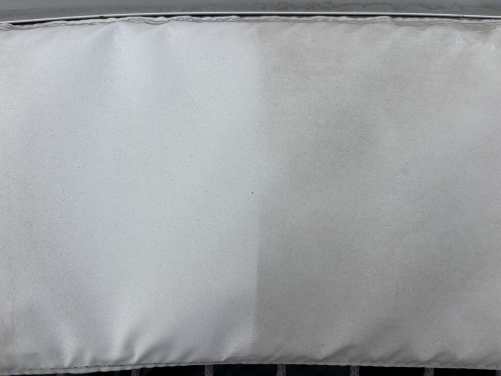 先日、カタマランクルーザーのバウデッキに設置されているネット状のデッキ「トランポリン」の黒ずみ除去を実施いたしました。