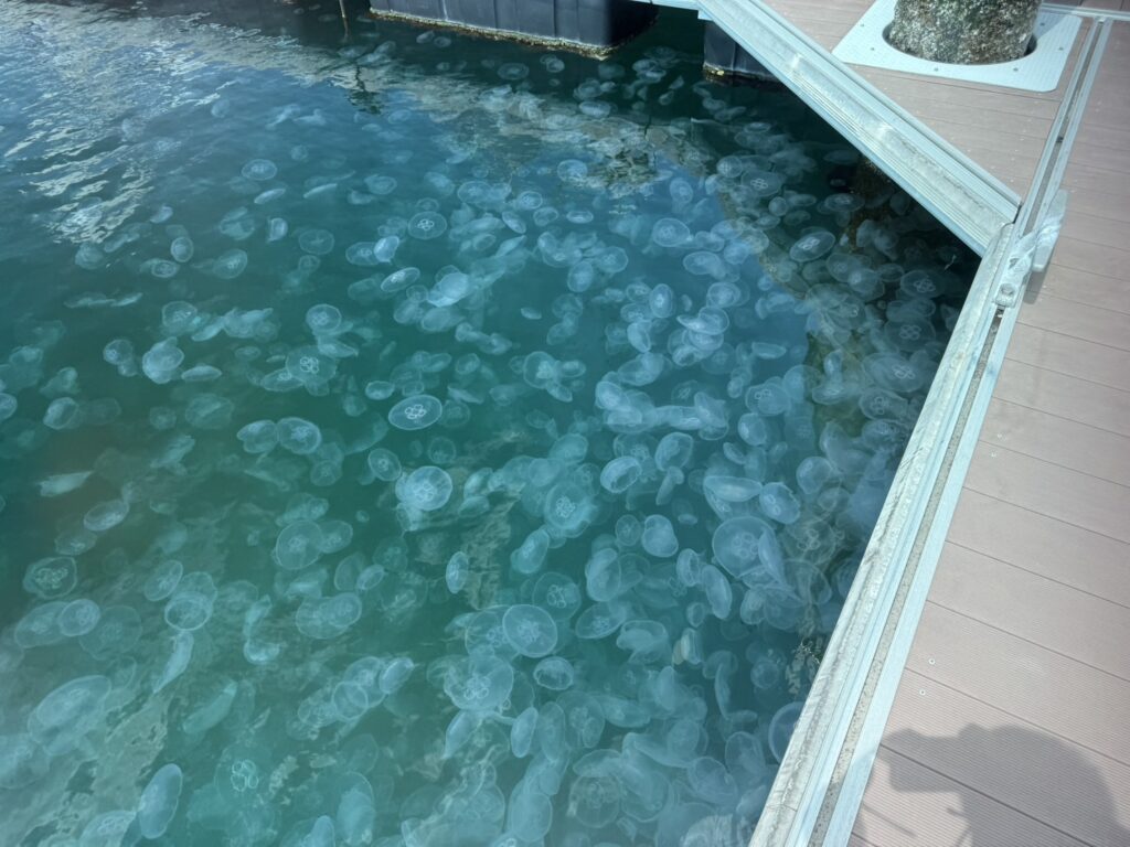 ここ最近、マリーナ内では水クラゲが大量に発生しており、海面を見渡すと至るところにふわふわと漂っています。